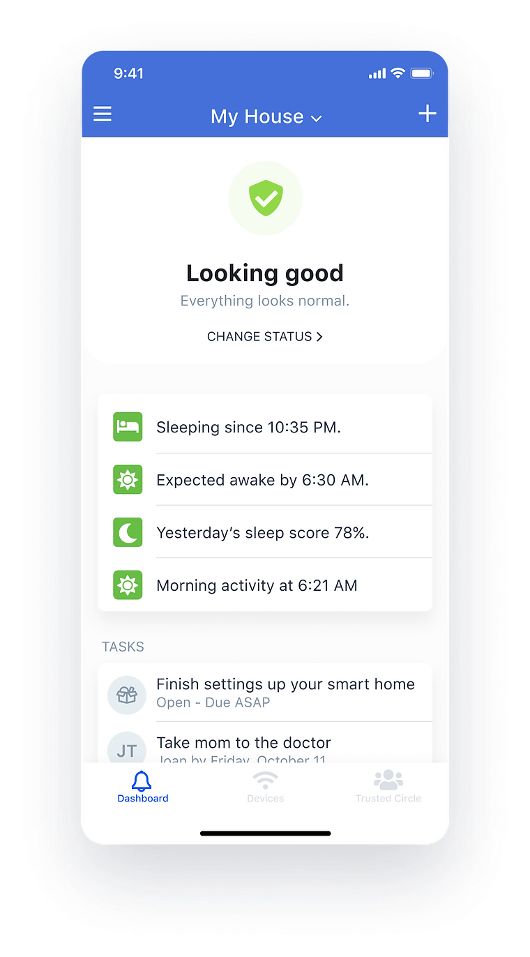 The resident’s normal lifestyle patterns are learned without invading privacy while family members can access real-time insights from anywhere.